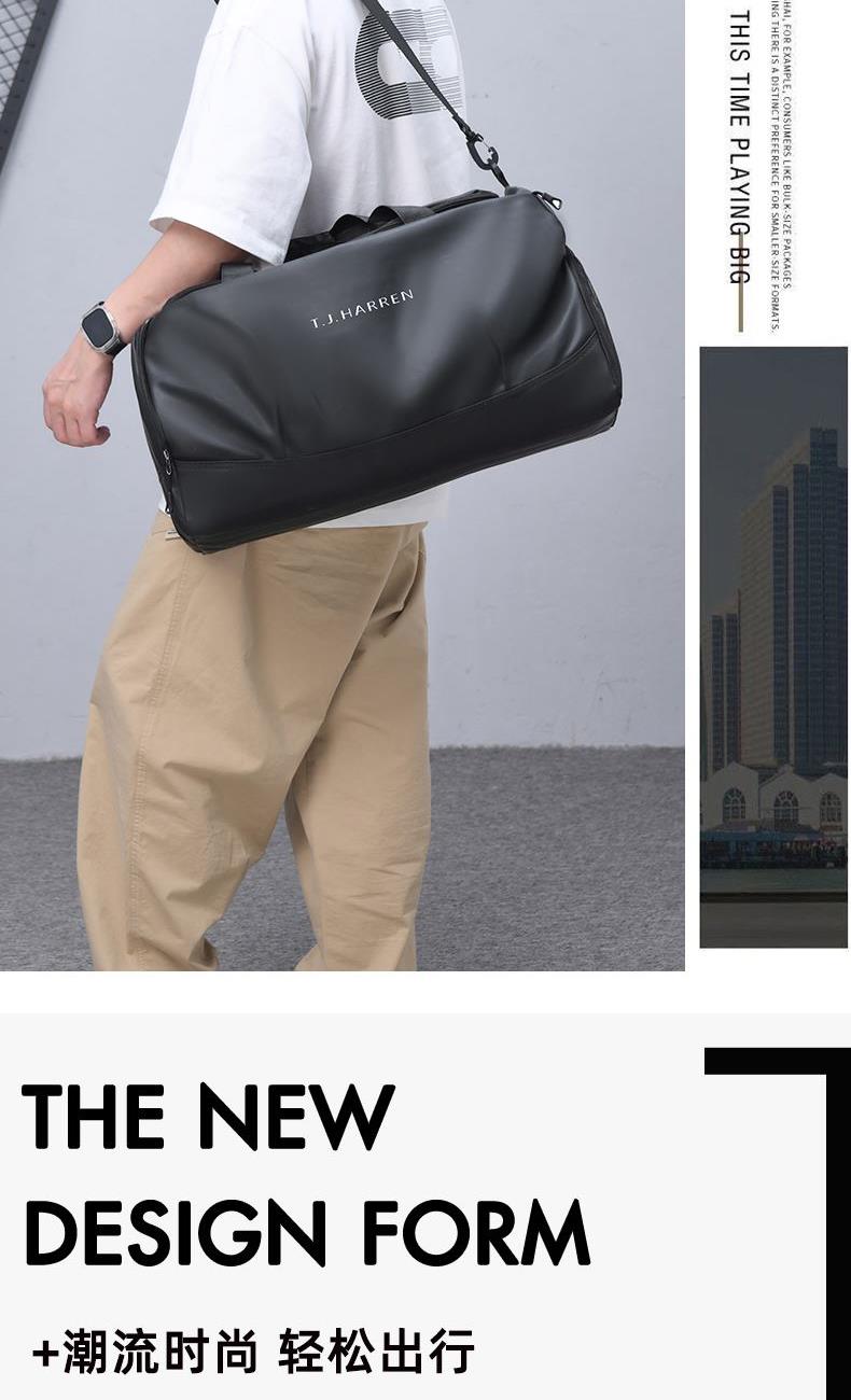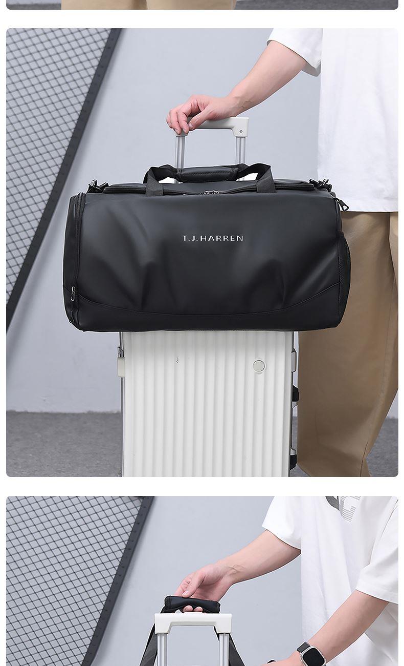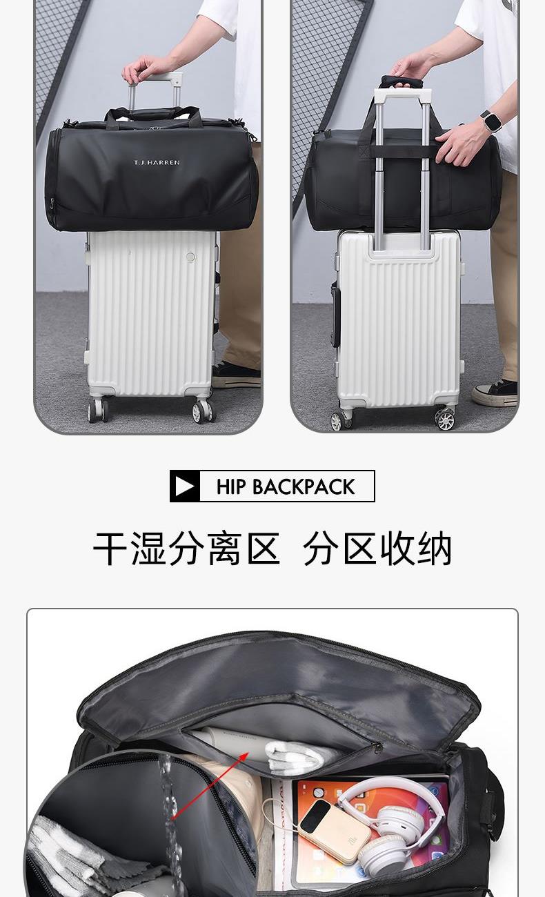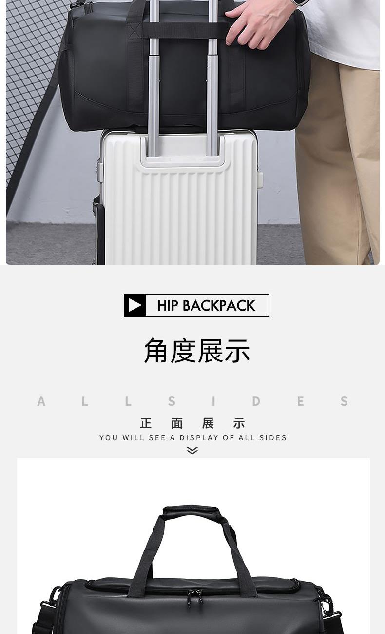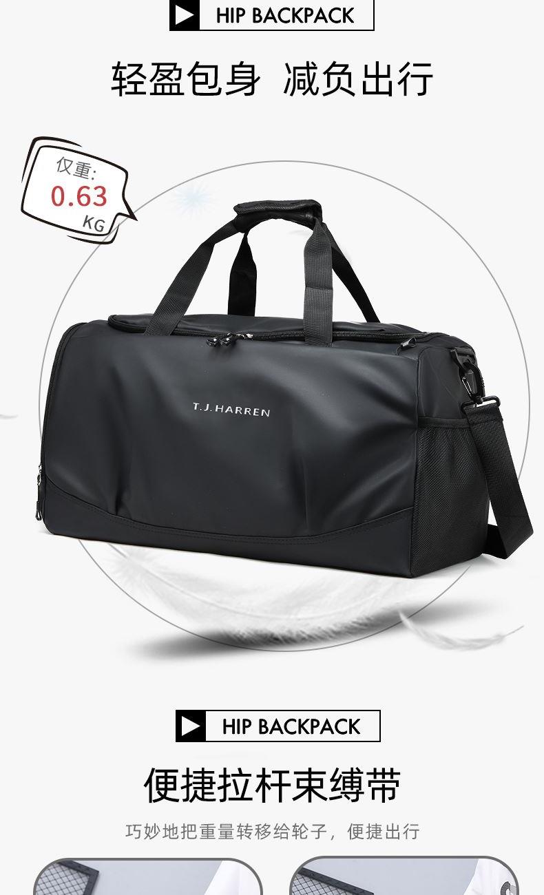 1、新款輕量化設計,輕盈時尚;2、防潑水皮膜面料,一擦即干,輕松打理;3、多隔層結構,分區合理,輕松收納;4、主袋約38L大容量,裝的更多;5、獨立鞋倉設計,干凈易清理;6、大容量前置拉鏈袋,放置貼身物品;7、內置干濕分離袋,分區收納;8、網兜側袋設計,放置更多物件;9、拉桿固定束帶設計,解放雙手;10、加大加厚舒適提手與肩帶,可背可提,出行更方便;11、支持客戶定制。