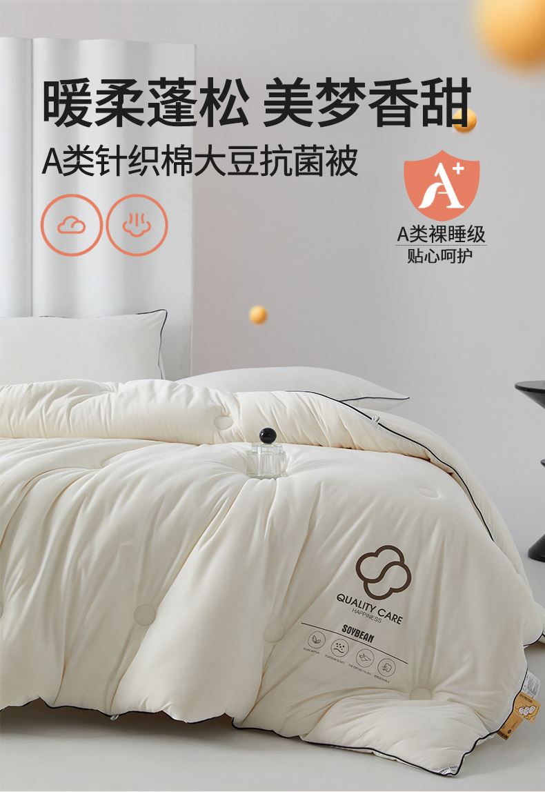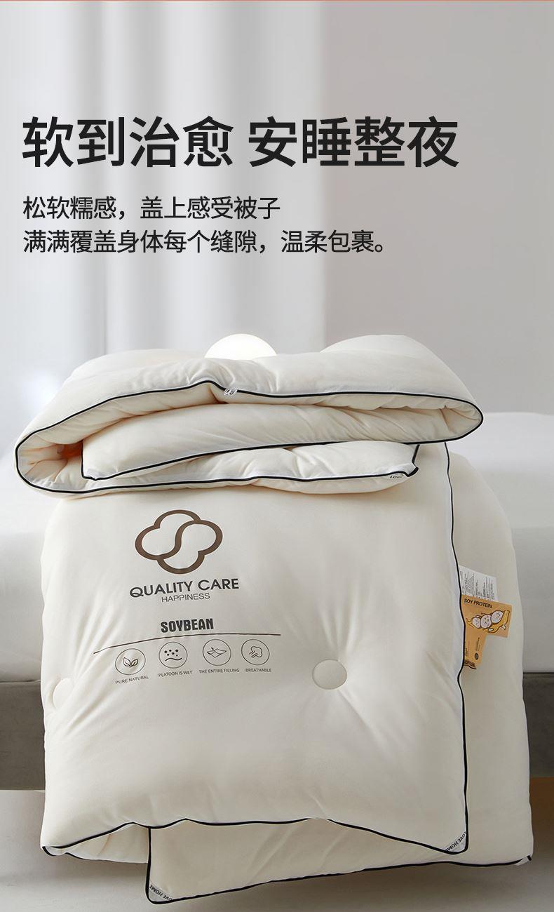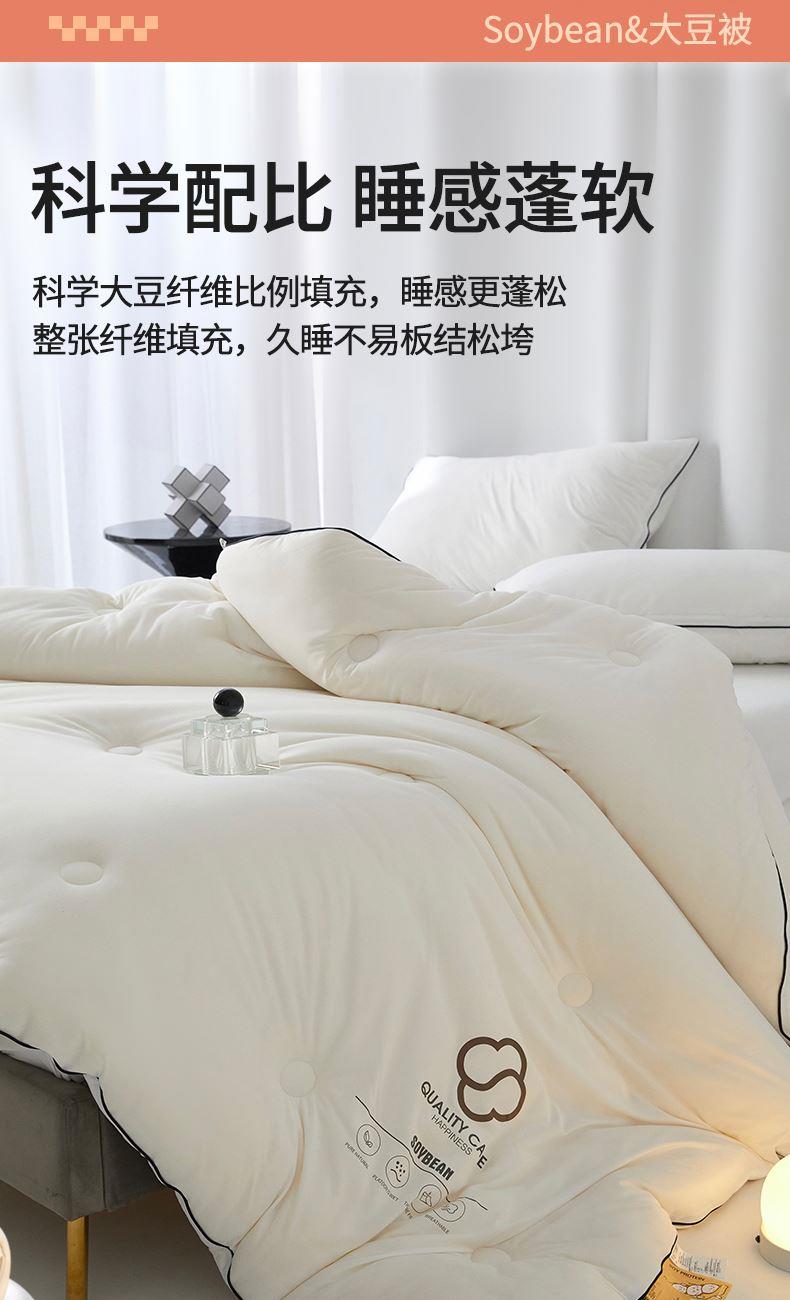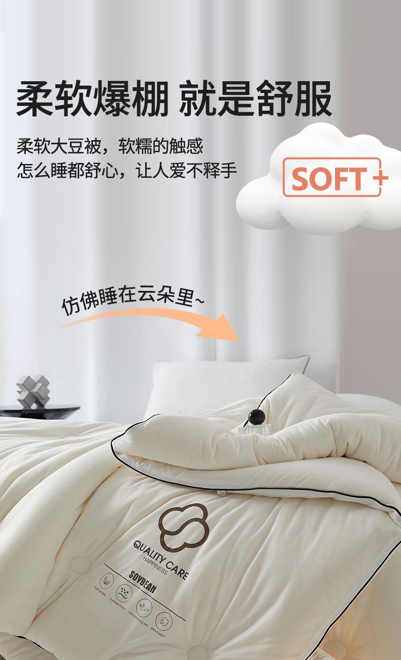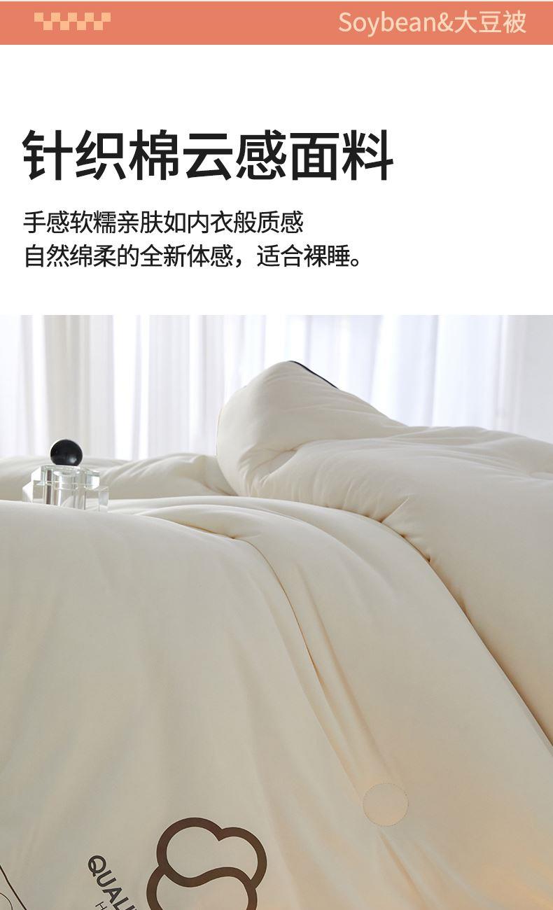 面料:針織棉(聚酯纖維) 填充:10%大豆纖維  +90%聚酯纖維 規格:200cm*230cm 填充克重:2000g 總重量:3000g 包裝:精美軟包 針織面料柔軟爆棚,就是舒服。 柔軟大豆被,軟糯的觸感怎么睡都舒心,讓人愛不釋手,SOFT仿佛睡在云朵里。