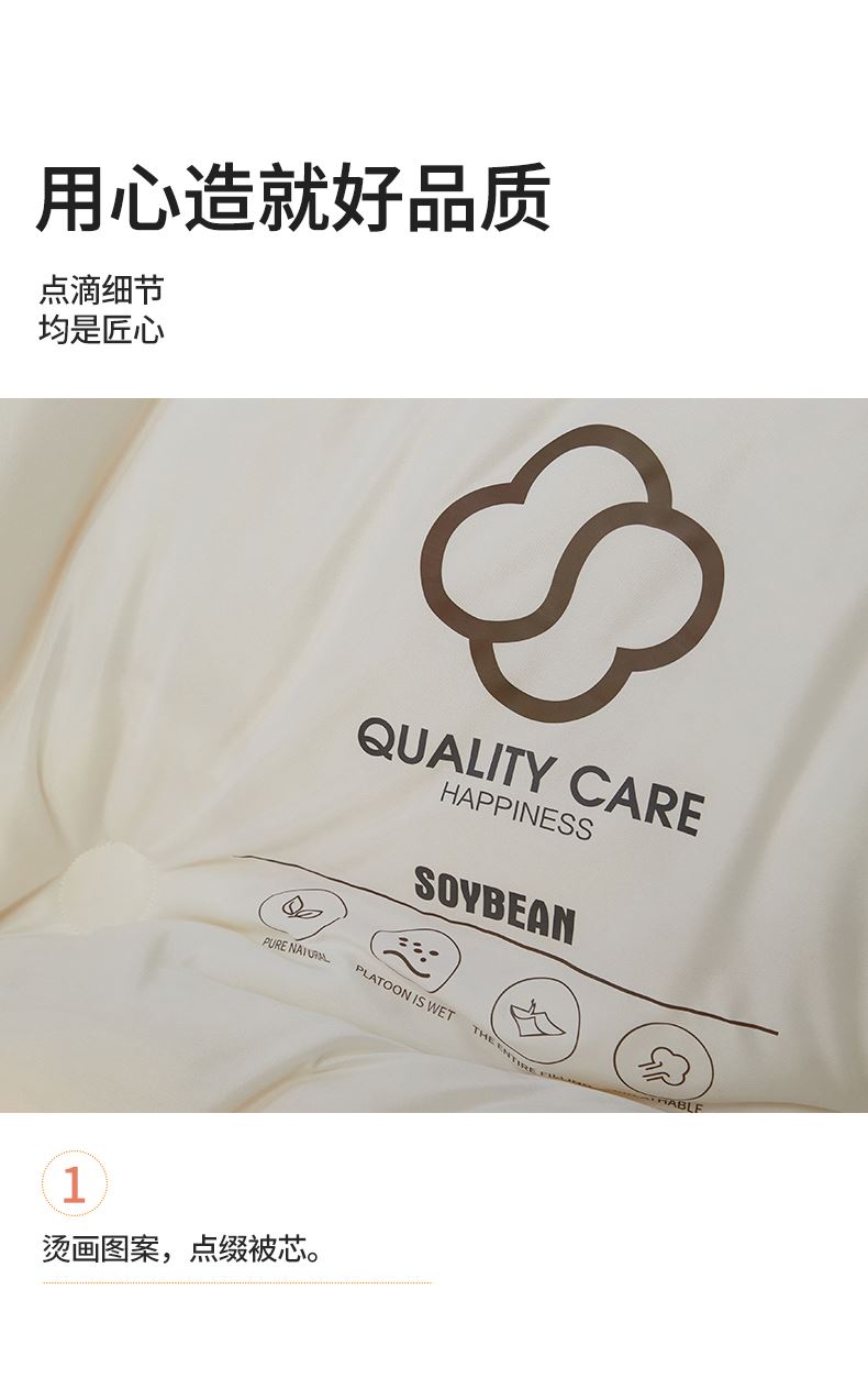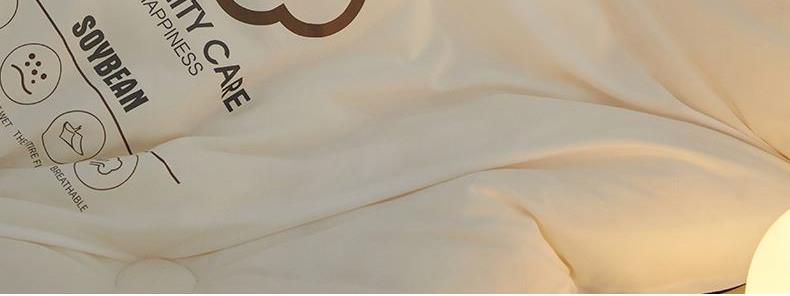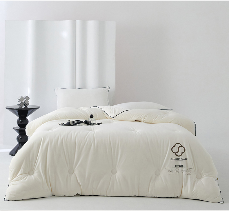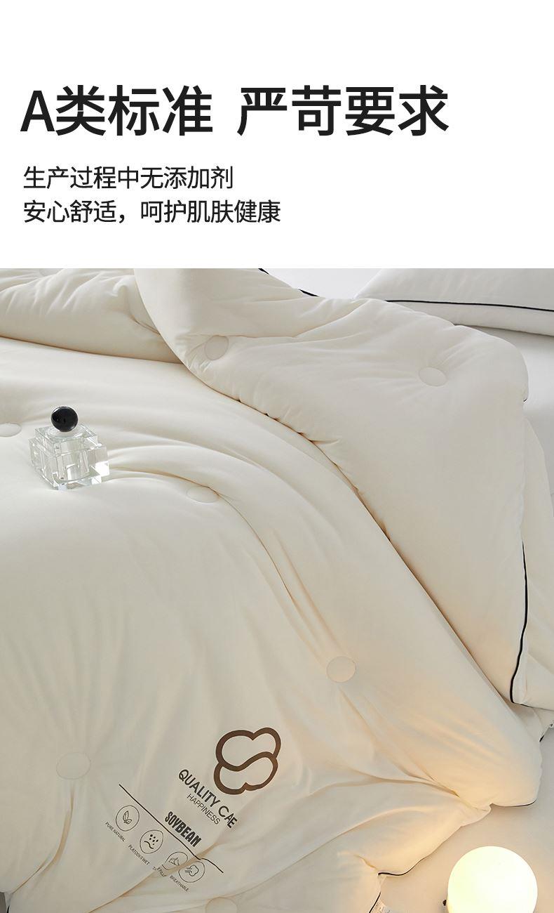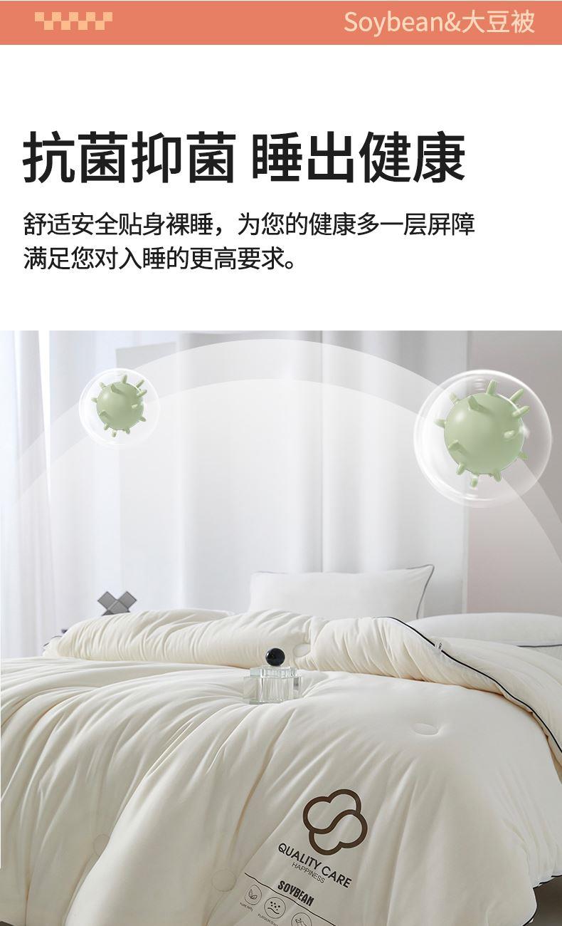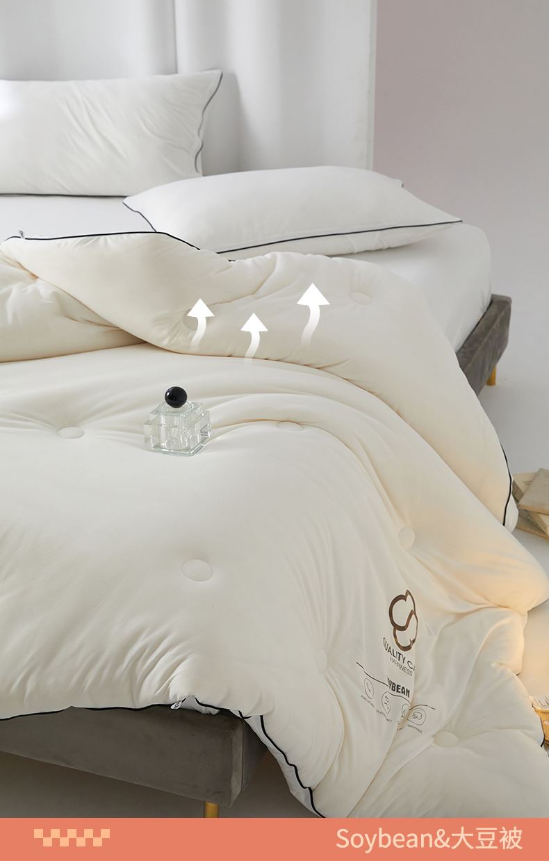 面料:針織棉(聚酯纖維) 填充:10%大豆纖維  +90%聚酯纖維 規格:200cm*230cm 填充克重:2000g 總重量:3000g 包裝:精美軟包 針織面料柔軟爆棚,就是舒服。 柔軟大豆被,軟糯的觸感怎么睡都舒心,讓人愛不釋手,SOFT仿佛睡在云朵里。