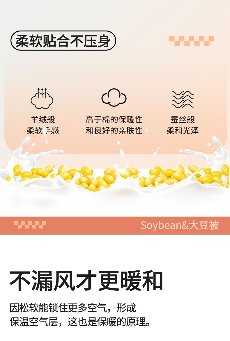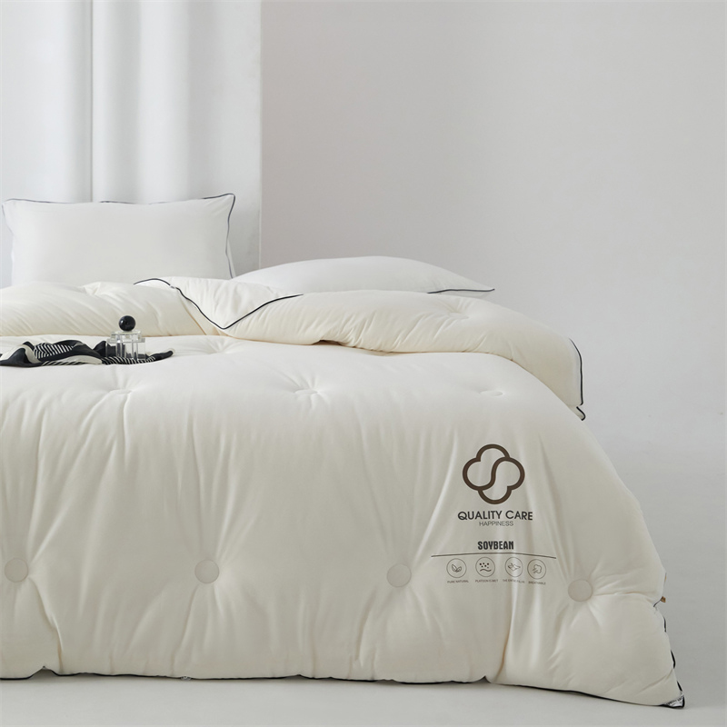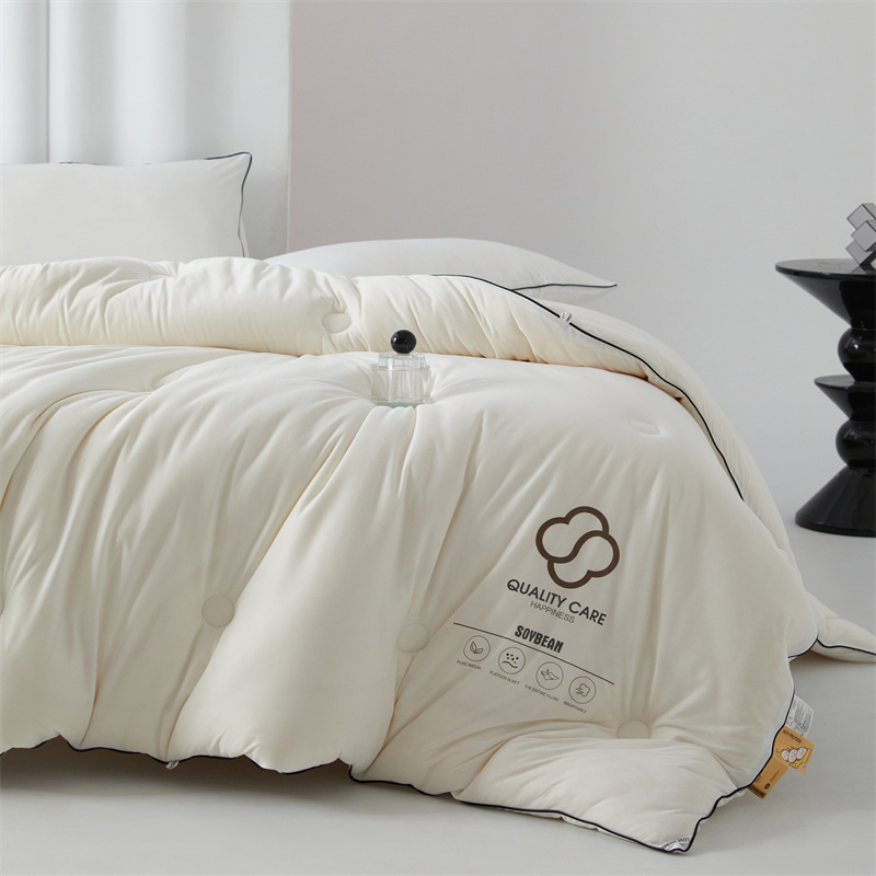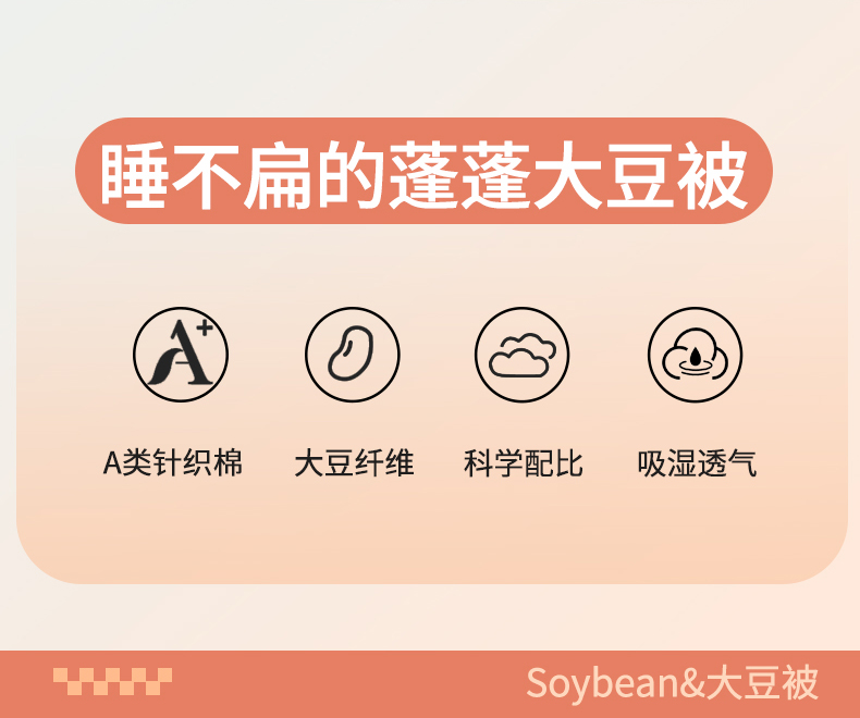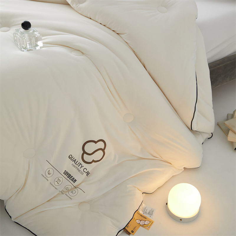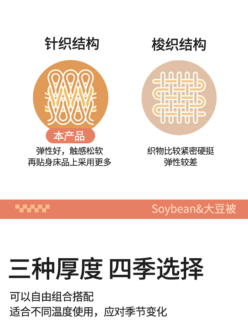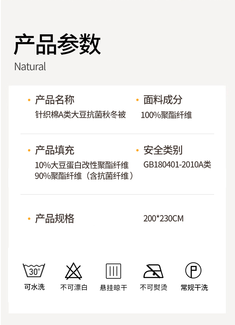 面料:針織棉(聚酯纖維) 填充:10%大豆纖維  +90%聚酯纖維 規格:200cm*230cm 填充克重:2000g 總重量:3000g 包裝:精美軟包 針織面料柔軟爆棚,就是舒服。 柔軟大豆被,軟糯的觸感怎么睡都舒心,讓人愛不釋手,SOFT仿佛睡在云朵里。