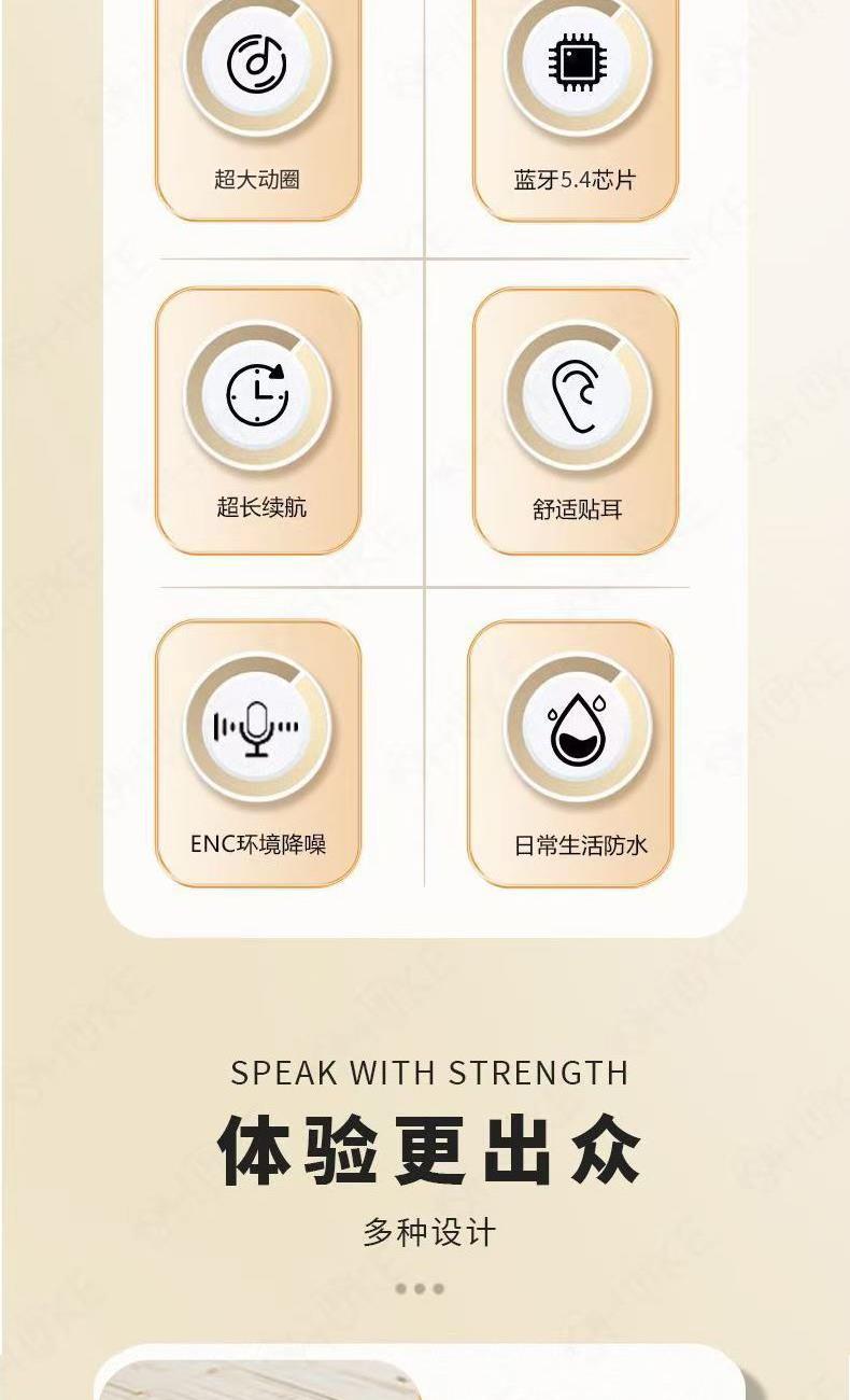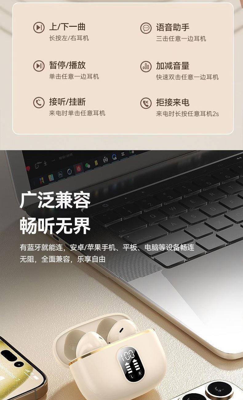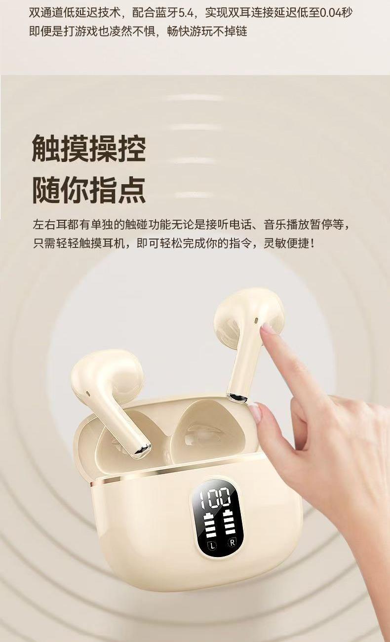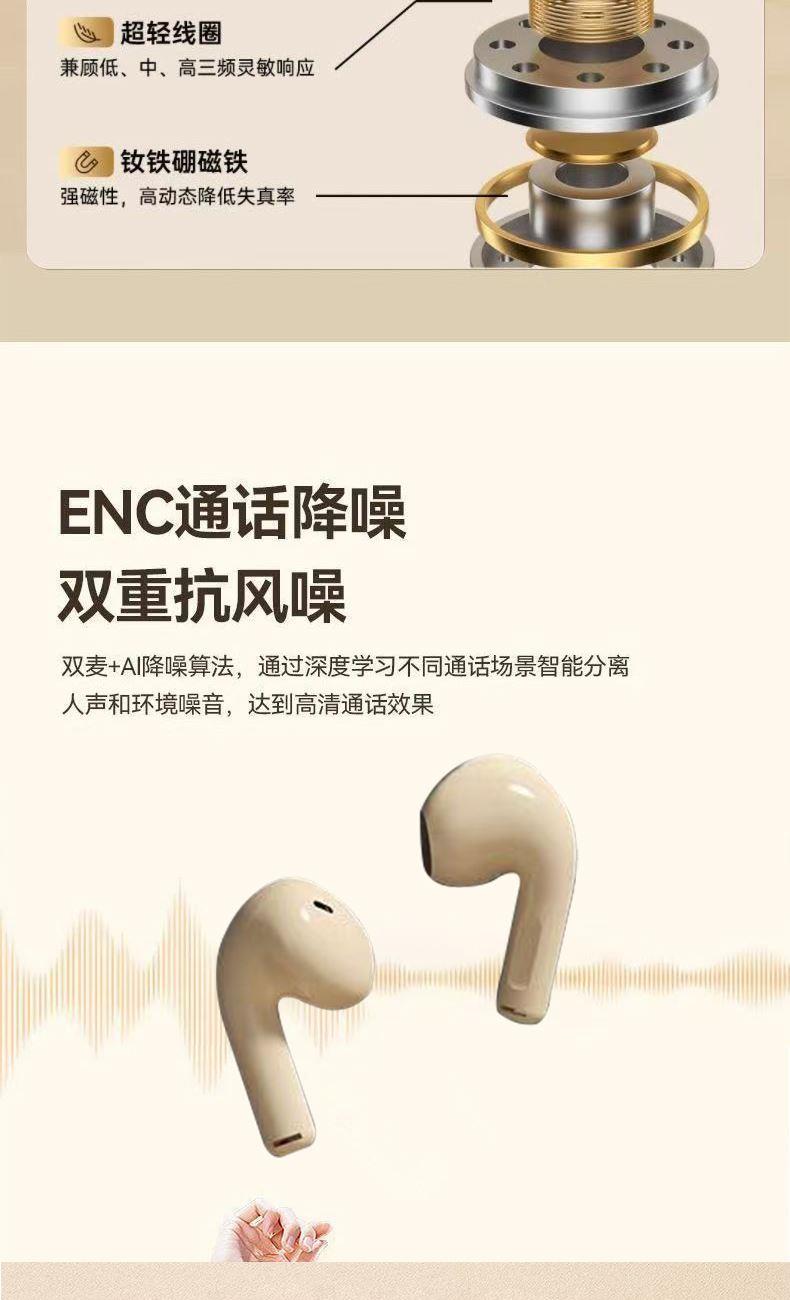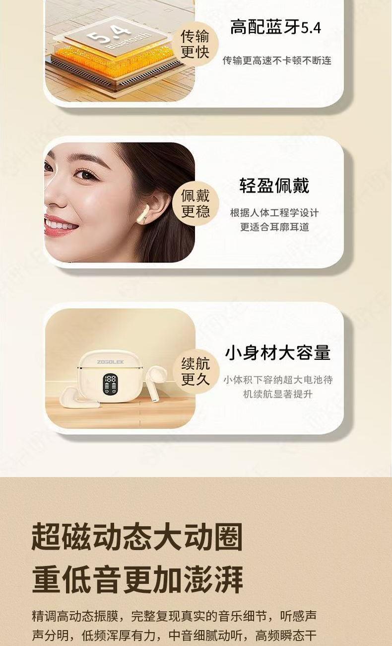 產品特點:1、精致小巧、佩戴舒適、攜帶方便;2、德國專業調音團隊,無限調試,適合每一雙挑剔的耳朵;3、數顯電量,一目了然,掌控電量,暢享無憂;4、低功耗DSP抗干擾Bluetooth5.4芯片,連接順暢不卡頓;5、ACC+SBC音頻解碼,無感延遲,音畫同步;6、封閉式腔體設計,減少失真,超大雙動圈發聲,無損音質,暢享重低音HIFI音效;7、ENC通話降噪,雙重抗風噪,實現高清通話;8、安全高標準鋰電池,續航更持久;9、生活防水,防水防汗,無懼風雨;10、禮盒包裝,支持定制。