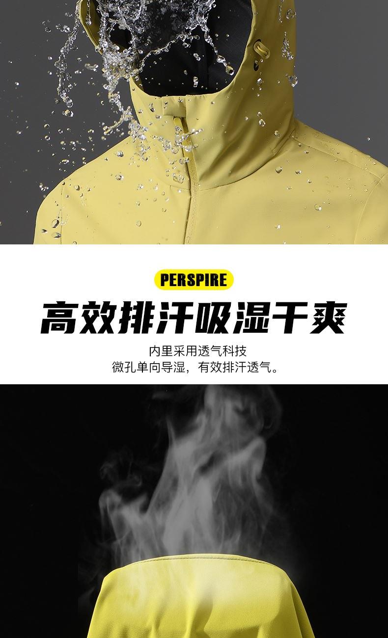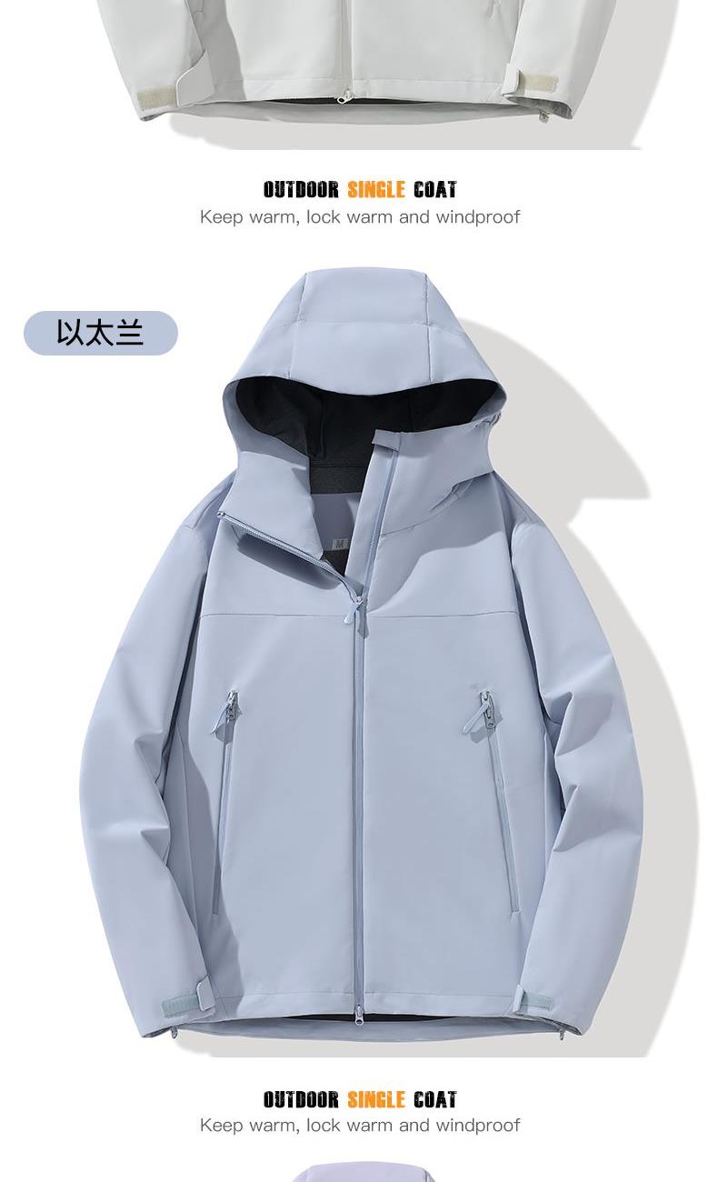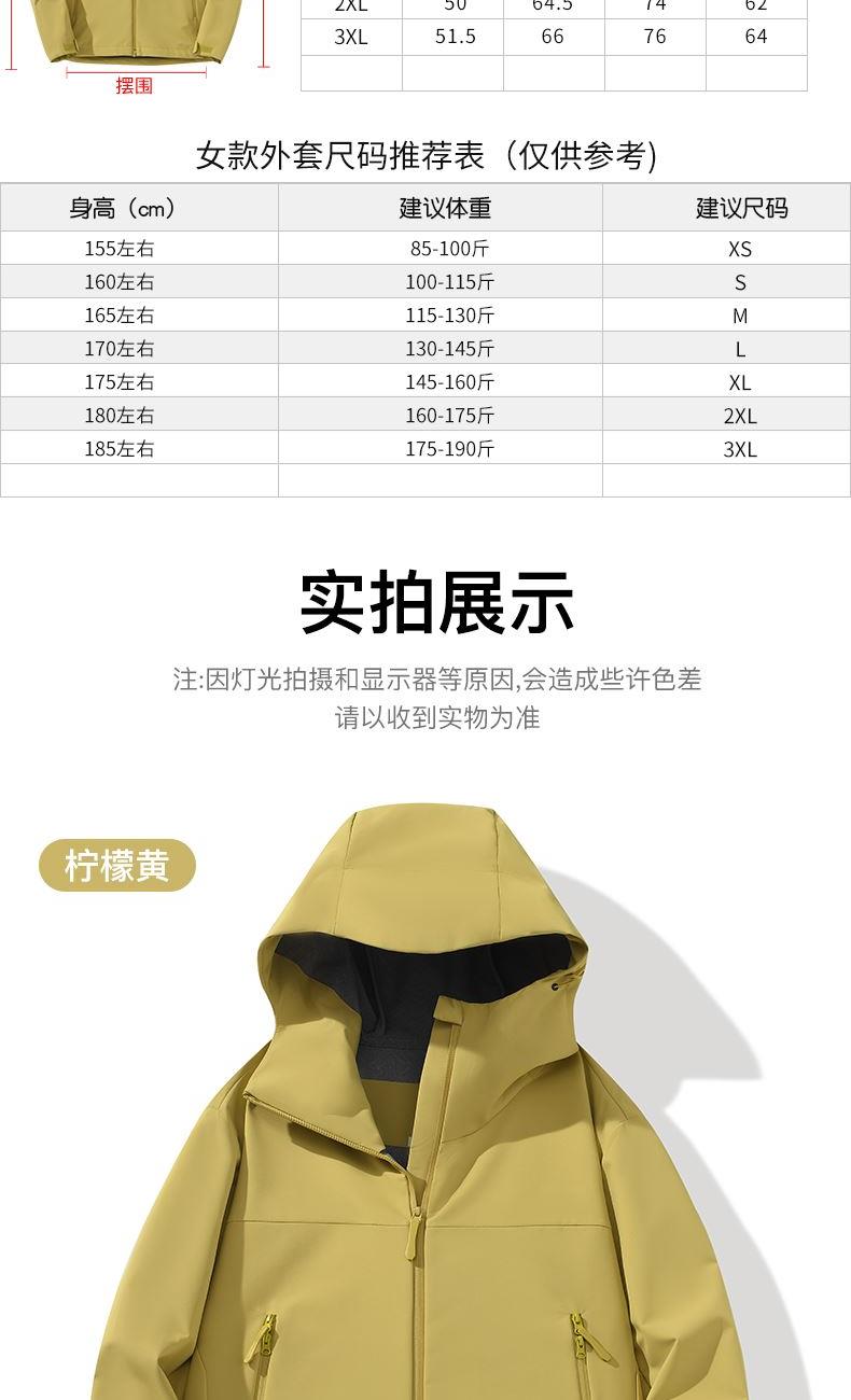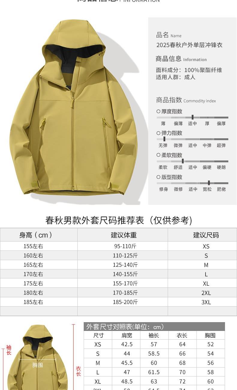 》面料沖鋒衣面料 》功能:防風防雨 》面料成分:90%尼龍10%氨綸 》版型:男女同款 》顏色:7色 》尺碼:XS-3XL 》產品優點: 耐磨抗撕裂 高彈力防水防雨防污 防風防雨 透濕性(m2*24H) 透氣干爽 強效保溫 適合日常通勤 登山露營