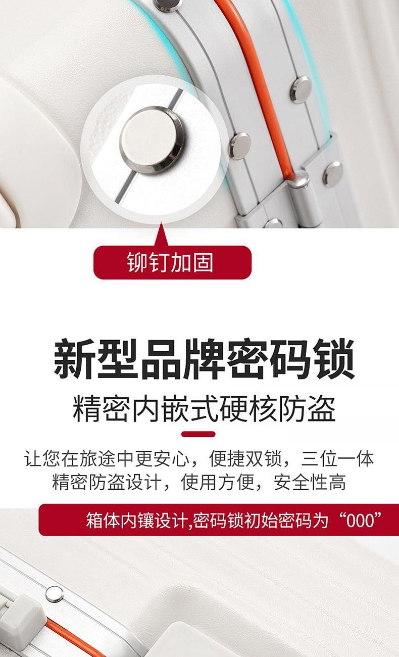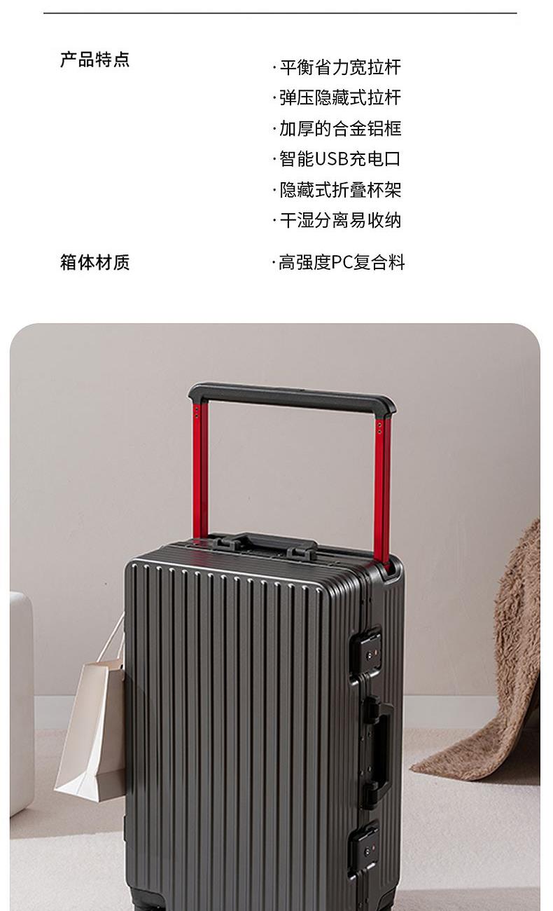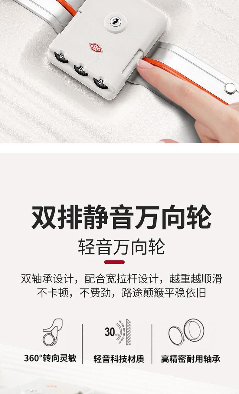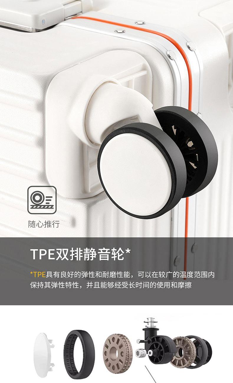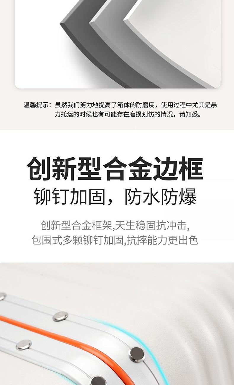 1、加厚PC合金外殼及鋁框和合頁,防刮堅(jiān)固,耐磨防爆;2、新款彈壓隱藏式加厚寬體拉桿設(shè)計(jì),拉桿一按自動彈出;3、寬體拉桿箱內(nèi)空間比傳統(tǒng)拉桿箱更大更平整;4、帶慢回彈頂部和側(cè)部提手,豎提橫提都方便;5、側(cè)部頂腳防剮蹭,同時(shí)帶方便行李掛架功能;6、大雙網(wǎng)結(jié)構(gòu),干濕分離,分區(qū)合理;7、帶USB充電口及隱藏式杯架,出行更方便,8、耐用撞色合金拉桿,舒適手提,穩(wěn)固順滑;9、雙嵌入式三碼密碼鎖,安全性高,放心旅行;10、TPE萬向靜音飛機(jī)輪,高承重,肆意而行。